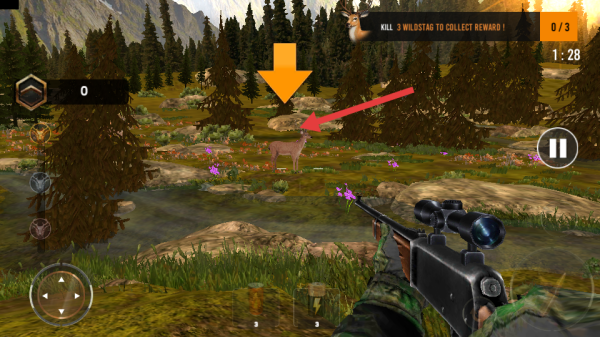 1、在山林的場景中,發(fā)現(xiàn)箭頭指向的野生的雄鹿目標的時候,瞄準目標,準備發(fā)起獵槍的狩獵。