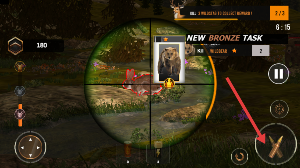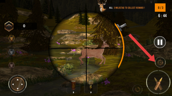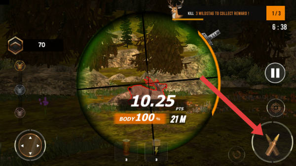 3、瞄準好雄鹿后,點擊箭頭指向的射擊按鍵,向雄鹿發(fā)射子彈,嘗試精準命中,完成狩獵目標。