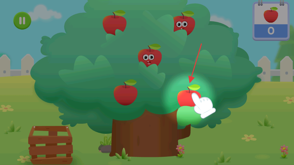 4、到達后,點擊樹上的蘋果扔進蘋果籃里,進行互動學(xué)習(xí)。