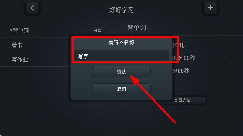 3、在彈窗中輸入寫字,點(diǎn)擊確認(rèn)按鈕,創(chuàng)建寫字學(xué)習(xí)計(jì)劃。