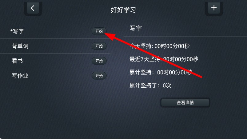 4、回到學(xué)習(xí)計(jì)劃頁(yè)面,點(diǎn)擊寫字計(jì)劃旁的開(kāi)始按鈕,進(jìn)入計(jì)時(shí)頁(yè)面。