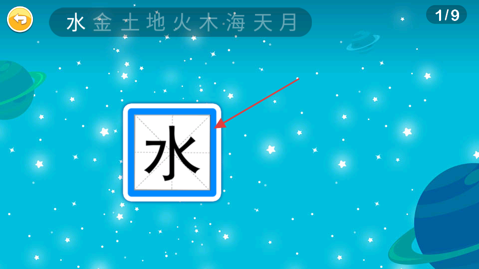 3、在太空館學(xué)習(xí)頁面,根據(jù)順序先學(xué)習(xí)漢字水。