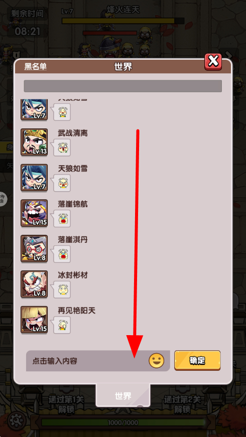 4、可與其他玩家進行交流互動,輸入想要發(fā)送的內(nèi)容,點擊確定,就能將信息發(fā)送到世界頻道,和其他玩家分享心得或交流策略。