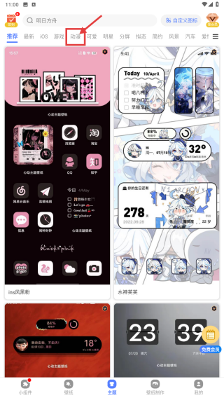 1、桌面美化設(shè)置:打開應(yīng)用后進(jìn)入“壁紙”或“主題”板塊,選擇喜歡的樣式點(diǎn)擊應(yīng)用,再添加小組件調(diào)整位置,完成桌面美化。