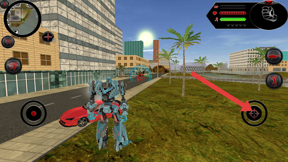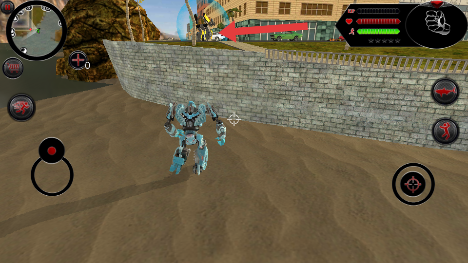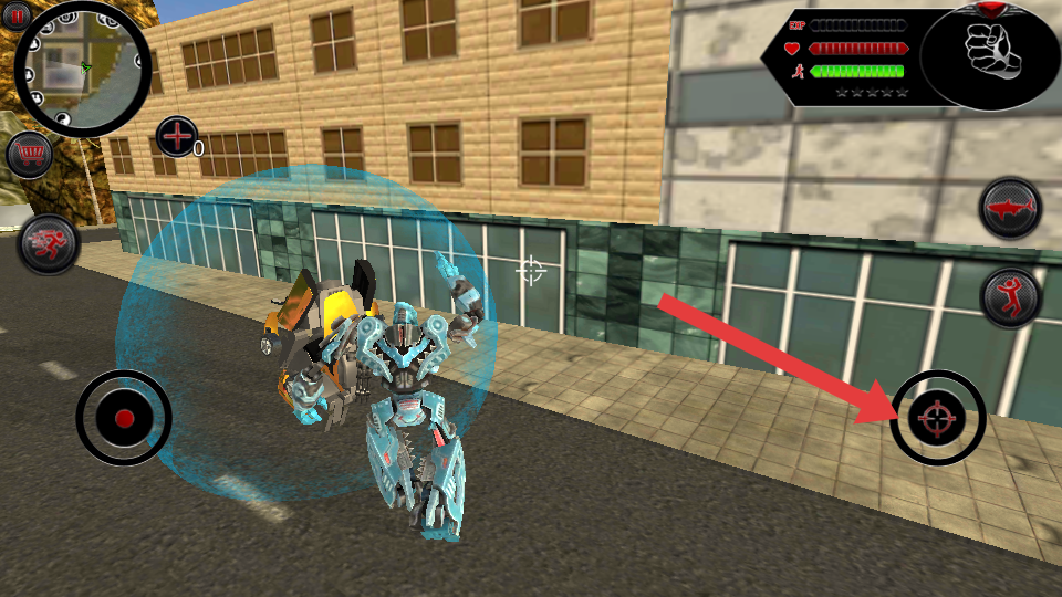 3、在與敵方機器人周旋時,點擊箭頭指向的瞄準按鍵,鎖定敵人后可發(fā)起有效攻擊,快速擊敗對手。