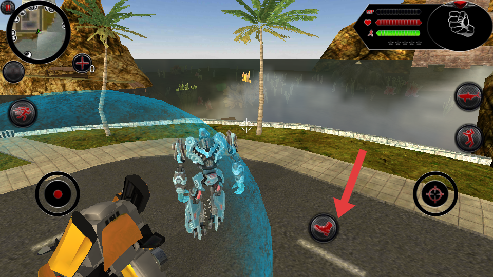 2、基礎操控與形態(tài)切換:通過左側(cè)操控移動方向,右側(cè)按鍵觸發(fā)攻擊,根據(jù)場景需求切換形態(tài),水下切換鯊魚提升移動速度,切換展開戰(zhàn)斗。