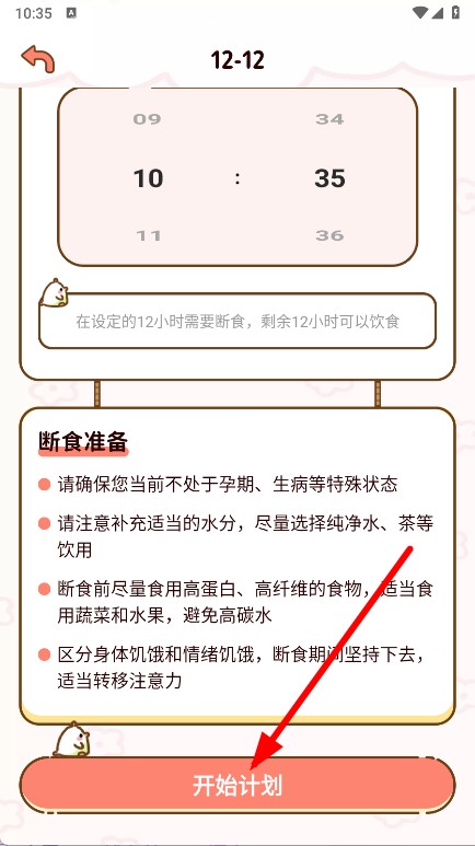 3、在模式詳情頁(yè),點(diǎn)擊開始計(jì)劃按鈕,進(jìn)入斷食計(jì)時(shí)頁(yè)面。