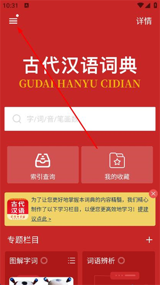 1、打開古代漢語詞典,點擊左上角的菜單圖標。