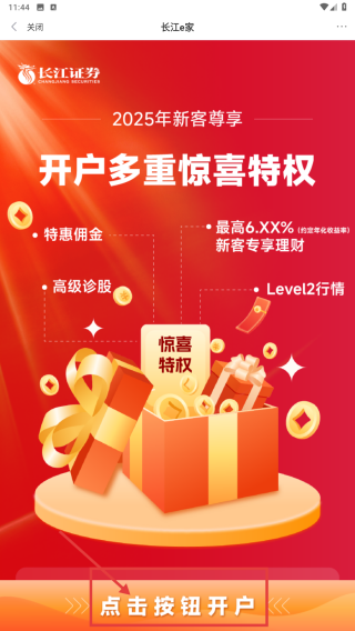 3、在長江證券開戶活動(dòng)頁面,點(diǎn)擊點(diǎn)擊按鈕開戶,進(jìn)入長江證券開戶流程頁面。