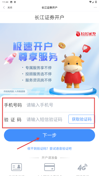 4、在長江證券開戶流程頁面,輸入手機(jī)號(hào)碼,獲取并輸入短信驗(yàn)證碼后,點(diǎn)擊下一步按鈕,推進(jìn)開戶流程。