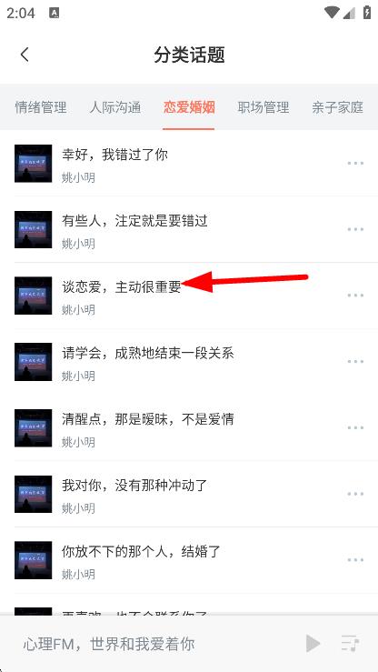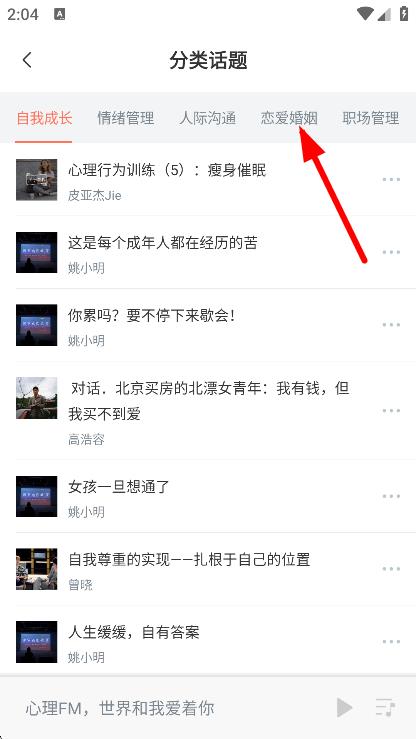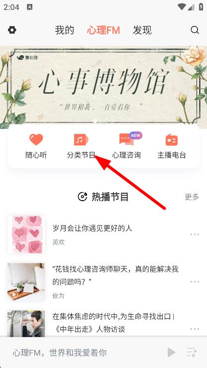 1、在心理FM頁(yè)面,點(diǎn)擊分類節(jié)目,進(jìn)入分類話題頁(yè)面。