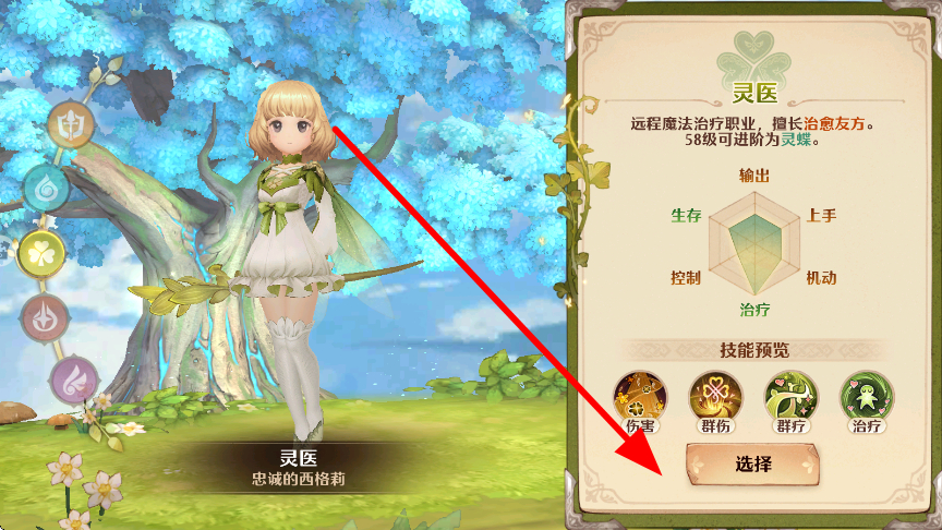 3、挑選選擇不同職業(yè),像靈醫(yī)這類遠(yuǎn)程魔法治療職業(yè),擅長治愈友方,56級可進(jìn)階,選擇好職業(yè)后,可運(yùn)用相應(yīng)技能開展冒險(xiǎn)。