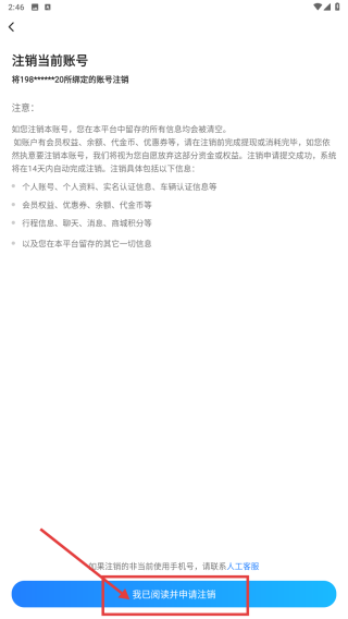 4、在注銷說明頁,點擊我已閱讀并申請注銷按鈕,完成賬號注銷操作。