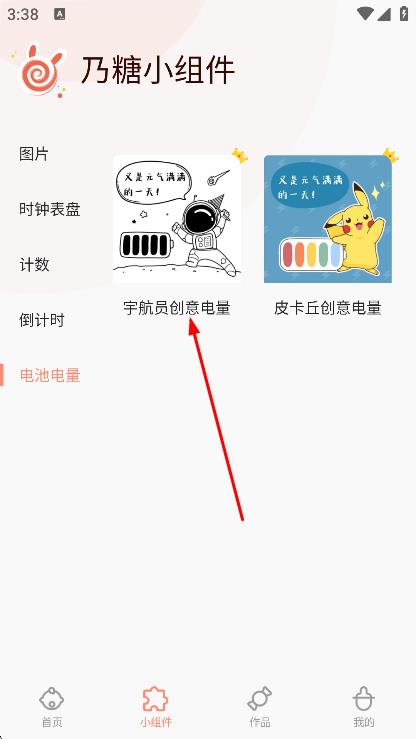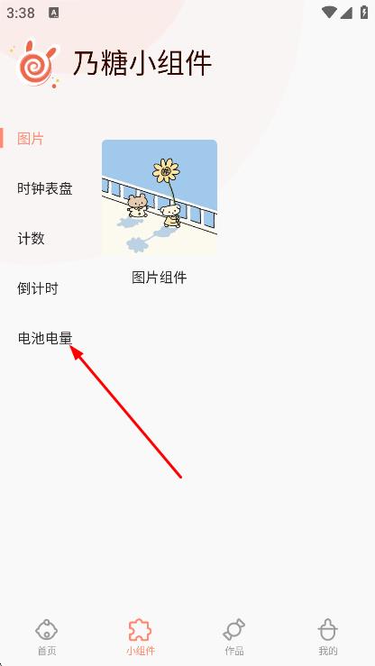2、在乃糖小組件頁面,點(diǎn)擊電池電量,進(jìn)入電池電量組件選擇頁面。