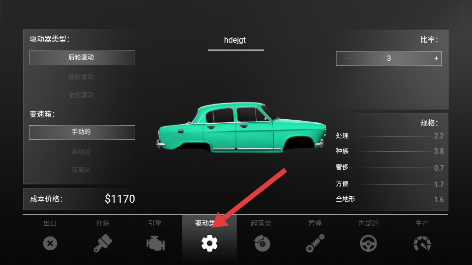 4、選擇后輪驅(qū)動(dòng)方式和手動(dòng)變速箱,調(diào)整比率等參數(shù),以此改變汽車(chē)的處理、種族等性能表現(xiàn)。