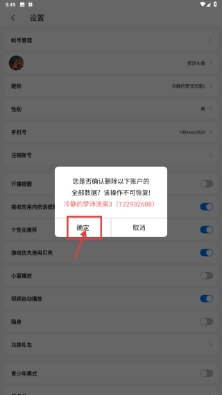 4、在注銷確認彈窗中,點擊確定按鈕,完成賬號注銷操作。