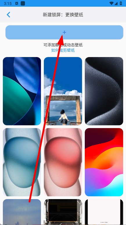 2、在新建鎖屏頁面,點(diǎn)擊頂部的+號(hào),可添加靜態(tài)或動(dòng)態(tài)壁紙。