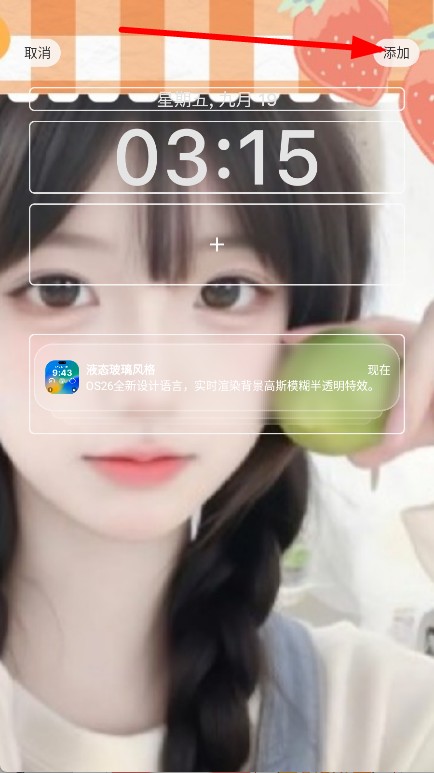 4、在鎖屏預(yù)覽頁面,點(diǎn)擊添加,即可將該壁紙?jiān)O(shè)置為鎖屏界面。