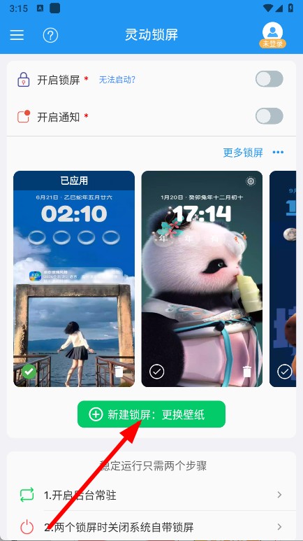 1、打開靈動(dòng)鎖屏APP,點(diǎn)擊新建鎖屏更換壁紙按鈕。