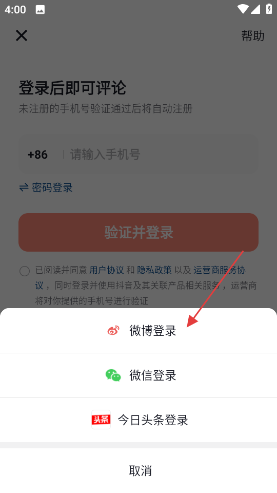 4、在彈出的登錄方式選擇中,可選擇微博登錄,登錄后即可評論。