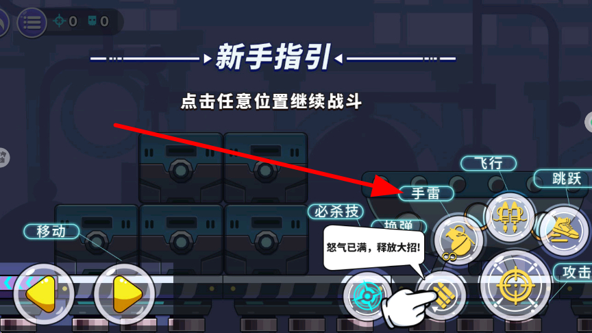 3、新手指引環(huán)節(jié),會提示各種操作,比如移動靠左右箭頭,還有手雷、必殺技等釋放方式,怒氣滿時釋放大招,能對敵人造成大量傷害,要留意指引學習操作。