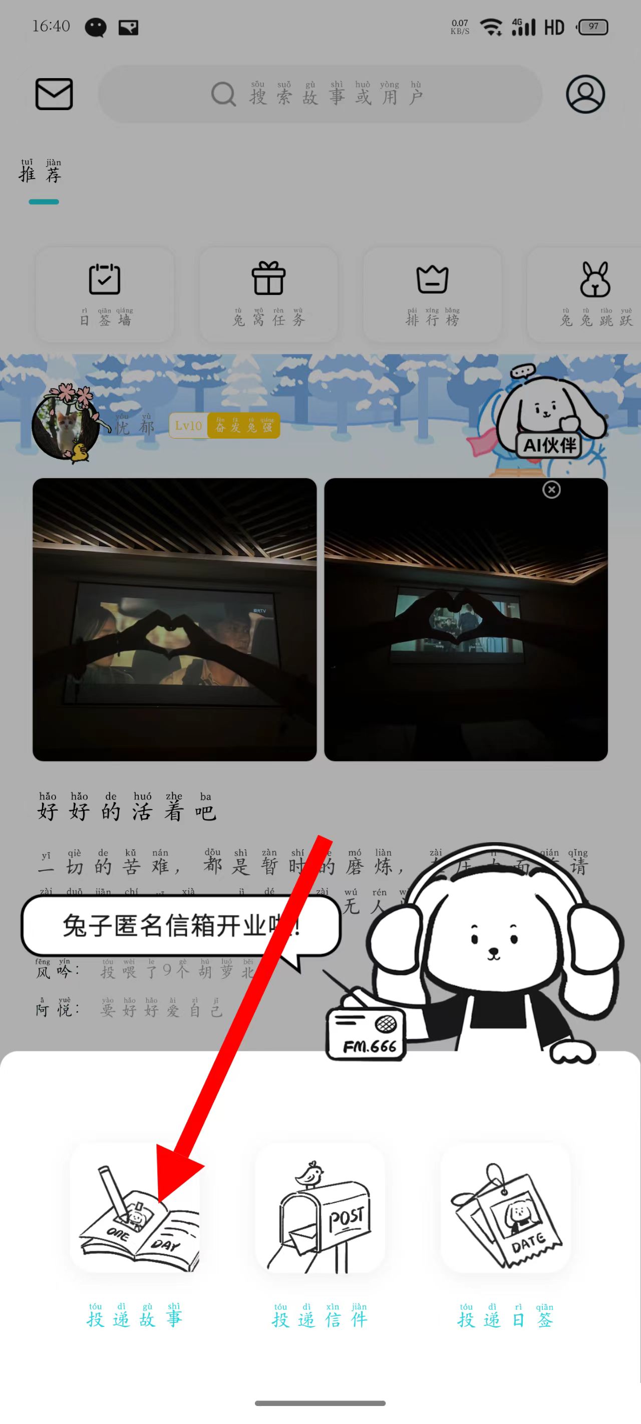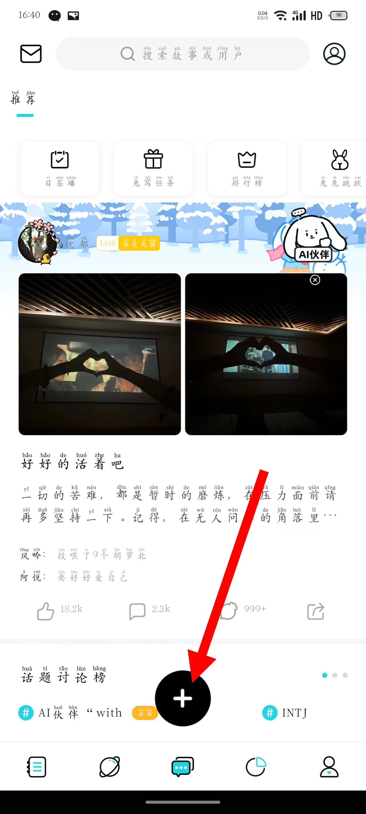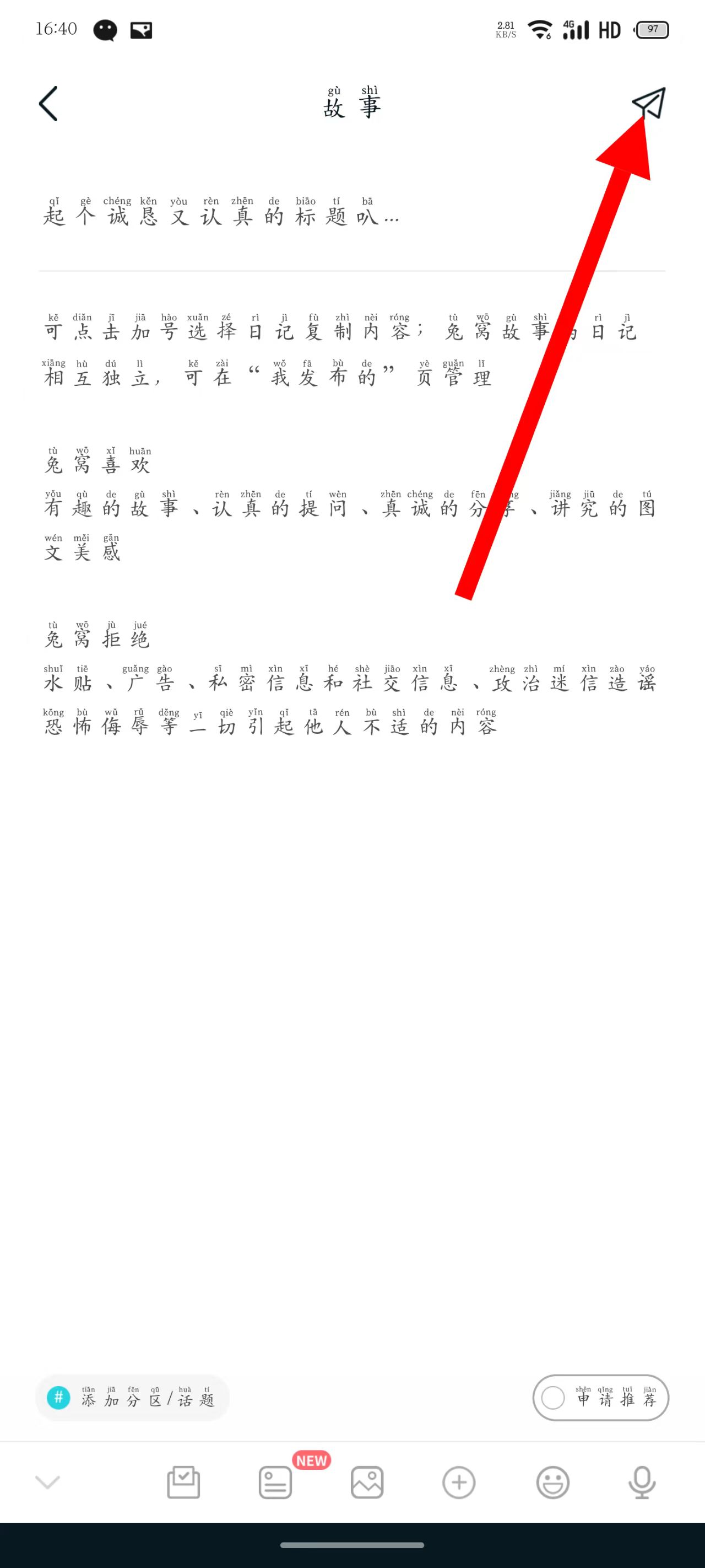 4、輸入標題和內容,可添加分區(qū)話題,即可發(fā)布故事。