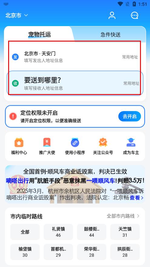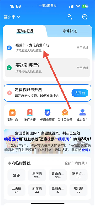 1、打開(kāi)一喂寵物托運(yùn)APP,在寵物托運(yùn)頁(yè)面填寫(xiě)發(fā)出人地址信息。