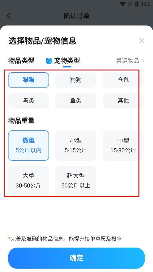 3、彈出選擇寵物類型和物品重量等信息,選擇后點(diǎn)擊確定。