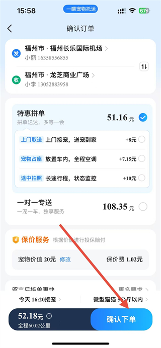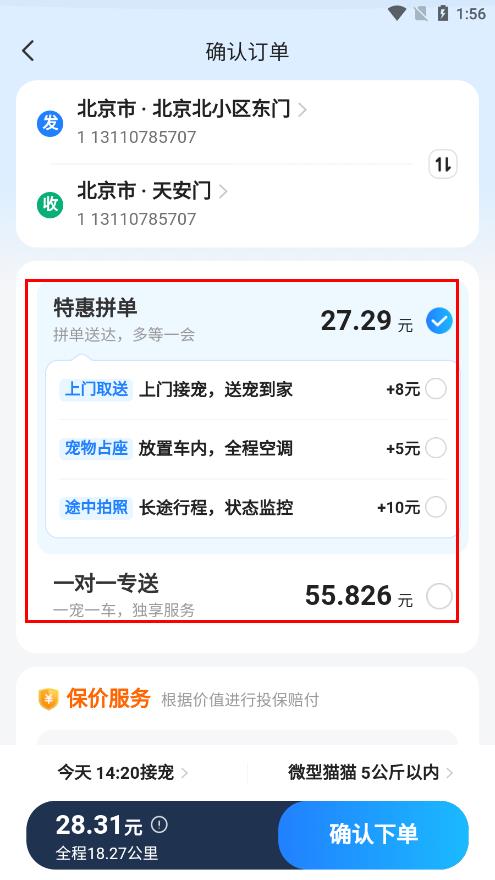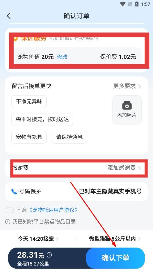 4、可以選擇保價(jià)服務(wù),根據(jù)填寫(xiě)的寵物價(jià)值收取保價(jià)費(fèi),也可添加感謝費(fèi),點(diǎn)擊確認(rèn)下單,即可看到最終的收費(fèi)金額。
