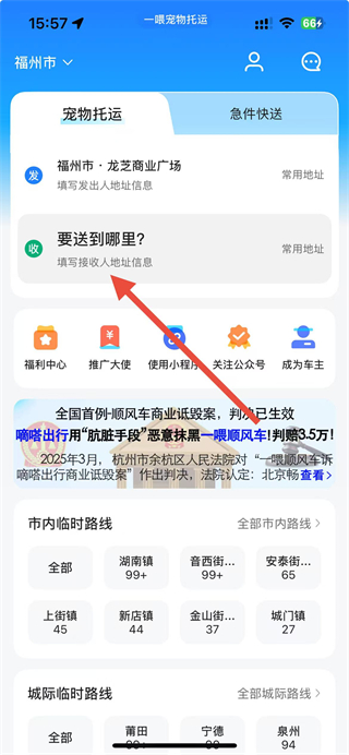 1、打開(kāi)一喂寵物托運(yùn)應(yīng)用,在首頁(yè)發(fā)欄填寫(xiě)出發(fā)地址,在收欄填寫(xiě)接收地址。