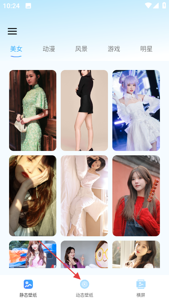 1、篩選查找心儀壁紙:打開軟件后,通過(guò)頂部分類欄或搜索框,選擇對(duì)應(yīng)類型或輸入關(guān)鍵詞,快速找到符合個(gè)人需求的動(dòng)態(tài)壁紙。