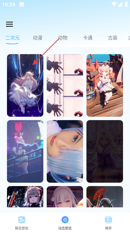 2、在動(dòng)態(tài)壁紙頁(yè)面,選擇二次元分類,并點(diǎn)擊喜歡的壁紙,進(jìn)入壁紙?jiān)斍轫?yè)。