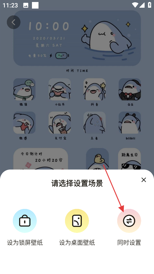 4、在設(shè)置場(chǎng)景選擇框中,選擇同時(shí)設(shè)置,將該壁紙?jiān)O(shè)為鎖屏和桌面壁紙。