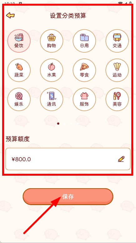 4、在設(shè)置分類預(yù)算頁面選擇分類、設(shè)置預(yù)算額度后點(diǎn)擊保存,完成分類預(yù)算設(shè)置。