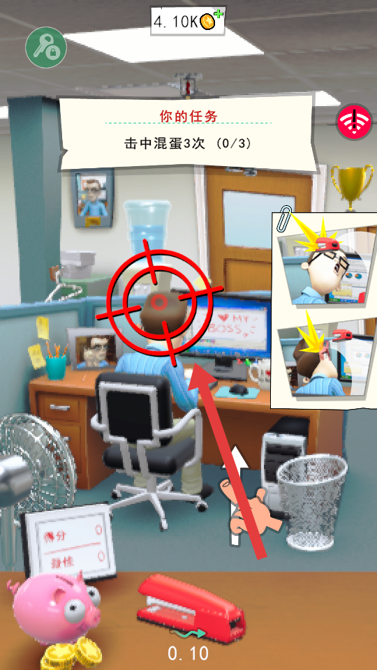 1、根據(jù)任務(wù)要求,瞄準(zhǔn)目標(biāo)人物,完成擊中混蛋3次的任務(wù),通過點(diǎn)擊操作發(fā)起攻擊。