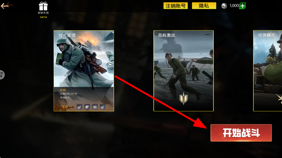 2、選擇好武器后,挑選喜歡的戰(zhàn)斗模式,比如城市廢墟、島嶼激戰(zhàn)等,然后點(diǎn)擊開始戰(zhàn)斗,進(jìn)入相應(yīng)的戰(zhàn)場。