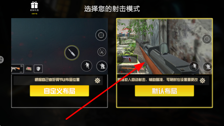 3、在射擊模式選擇界面,可根據(jù)自身喜好,挑選自定義布局或默認(rèn)布局,調(diào)整射擊操作的方式,以便更好地進(jìn)行戰(zhàn)斗。
