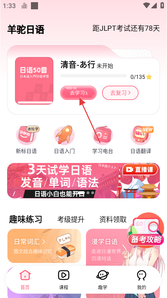 1、選擇適配課程:打開軟件后,根據(jù)自身日語水平在課程板塊挑選對應(yīng)內(nèi)容(如入門語法、N2備考課程),跟隨課程逐步學(xué)習(xí)。