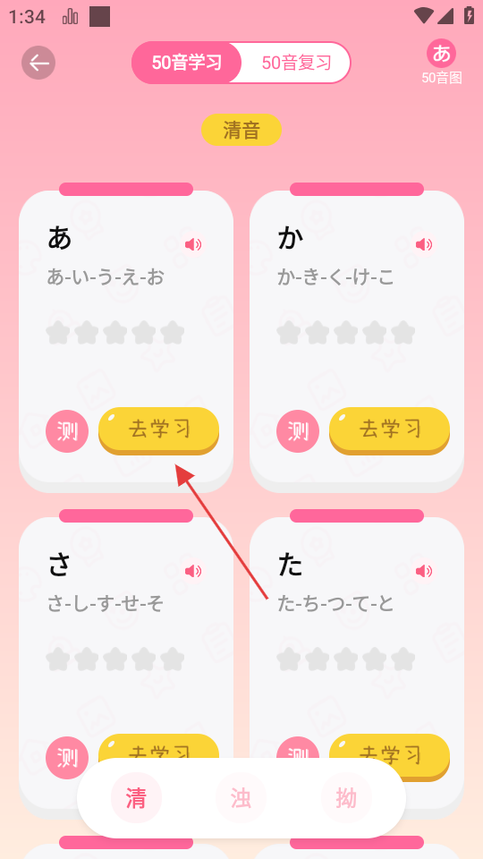 1、在首頁,點擊清音-あ行旁的去學(xué)習(xí)按鈕,進(jìn)入50音學(xué)習(xí)頁面。