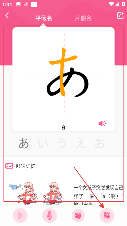 3、在假名學(xué)習(xí)頁面,可查看平假名寫法發(fā)音等,點擊練按鈕進(jìn)入練習(xí)環(huán)節(jié)。