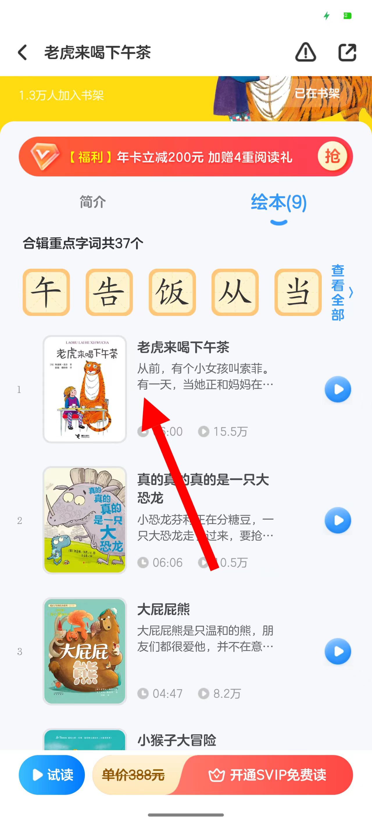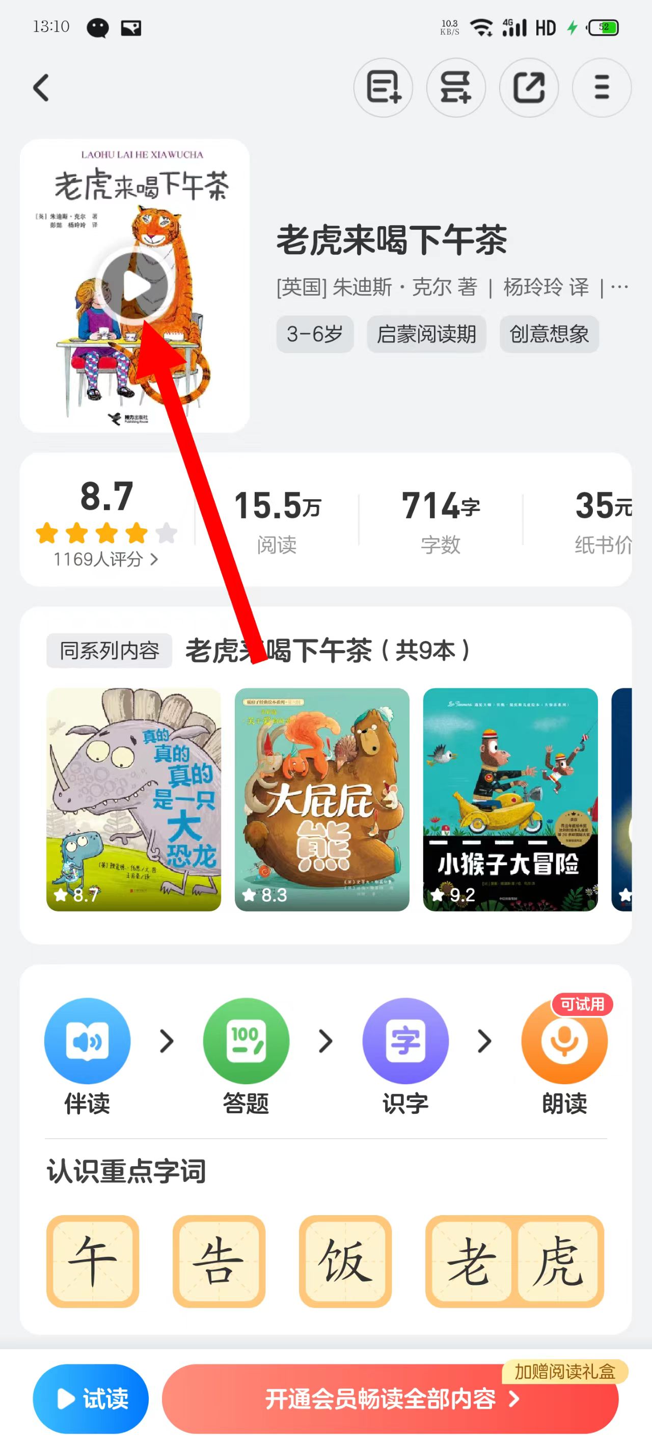 3、在合輯頁面點擊老虎來喝下午茶繪本,進(jìn)入繪本詳情頁面。