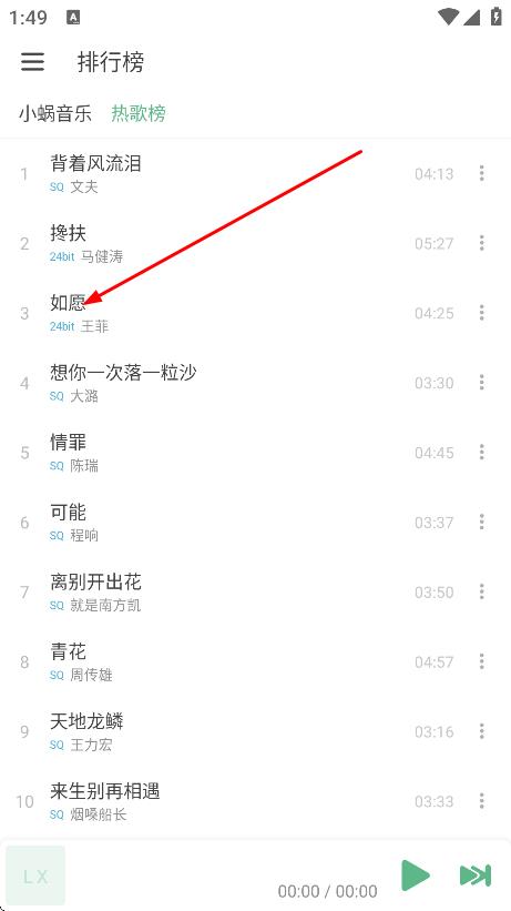 3、在排行榜頁面,點擊想要播放的歌曲,例如王菲的如愿。