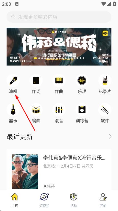 1、進(jìn)入首頁(yè),點(diǎn)擊頁(yè)面上的演唱,進(jìn)入演唱課程列表頁(yè)面。