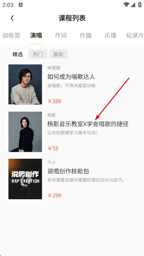 2、隨后可在演唱課程列表頁(yè)面,挑選想要購(gòu)買的課程。