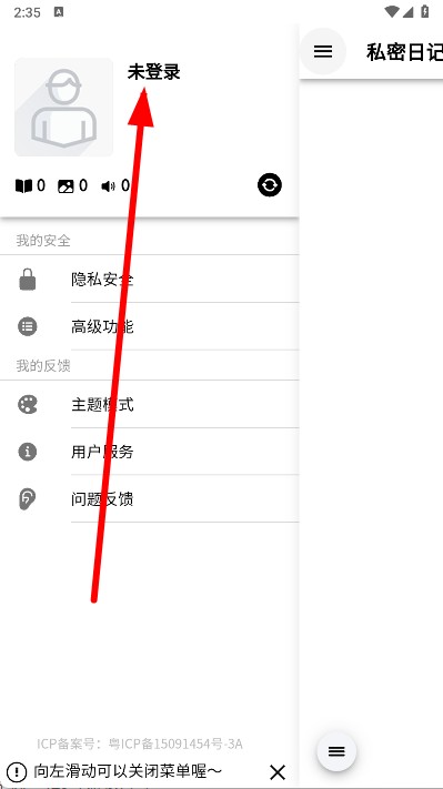 2、在側(cè)邊菜單中點擊未登錄區(qū)域,進入用戶登錄頁面。