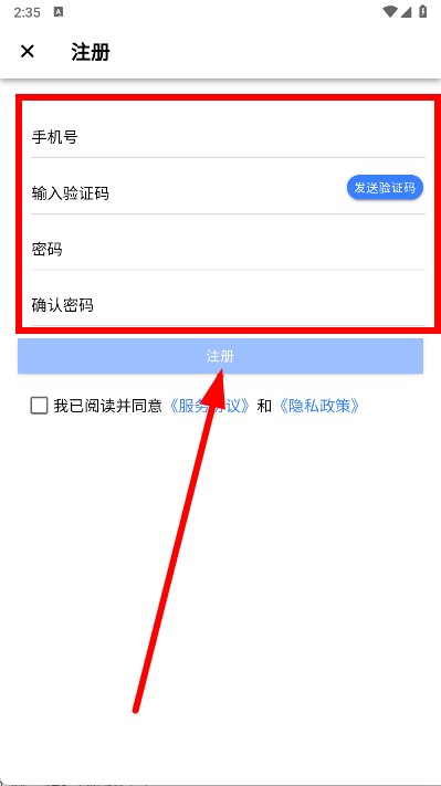 4、輸入手機號、驗證碼、確認密碼,勾選同意協(xié)議后點擊注冊,完成賬號注冊。