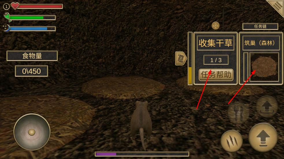 4、進入洞穴后,根據(jù)收集干草、筑巢等任務(wù)提示,使用收集的資源完成筑巢。