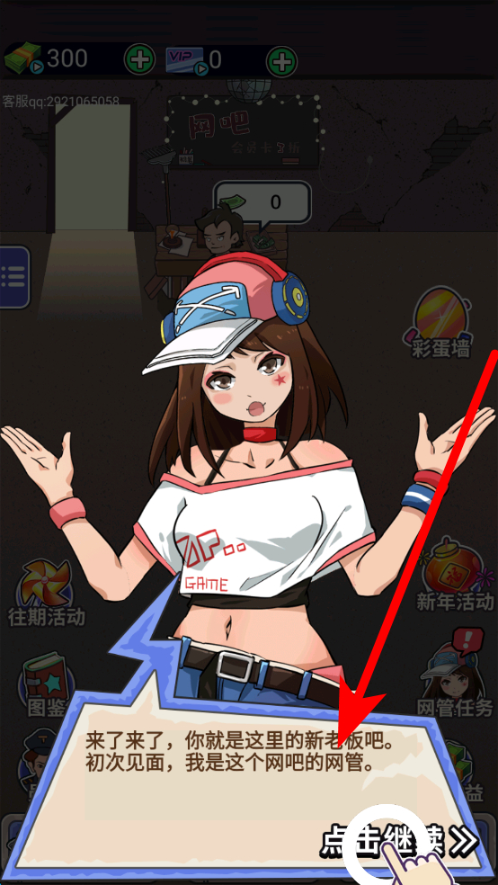 1、首先會有劇情引導(dǎo),出現(xiàn)相關(guān)畫面時,點(diǎn)擊點(diǎn)擊繼續(xù),推進(jìn)劇情,了解成為網(wǎng)吧老板的背景與初始設(shè)定。