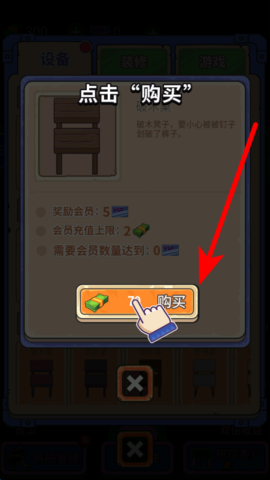 4、在管理界面中,若要購置設(shè)備,找到對應(yīng)的設(shè)備選項,當(dāng)滿足條件時,點(diǎn)擊“購買”按鈕,就能為網(wǎng)吧添加新設(shè)備,提升網(wǎng)吧的設(shè)施水平,吸引更多顧客。