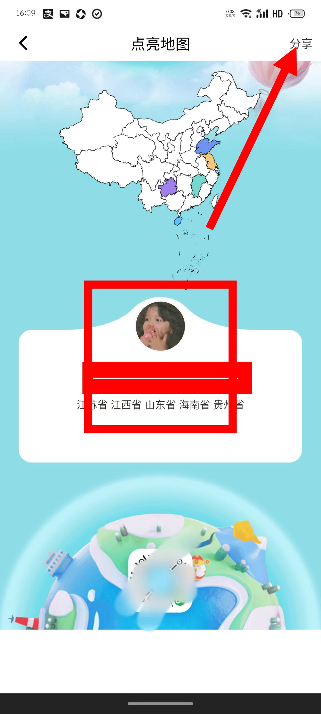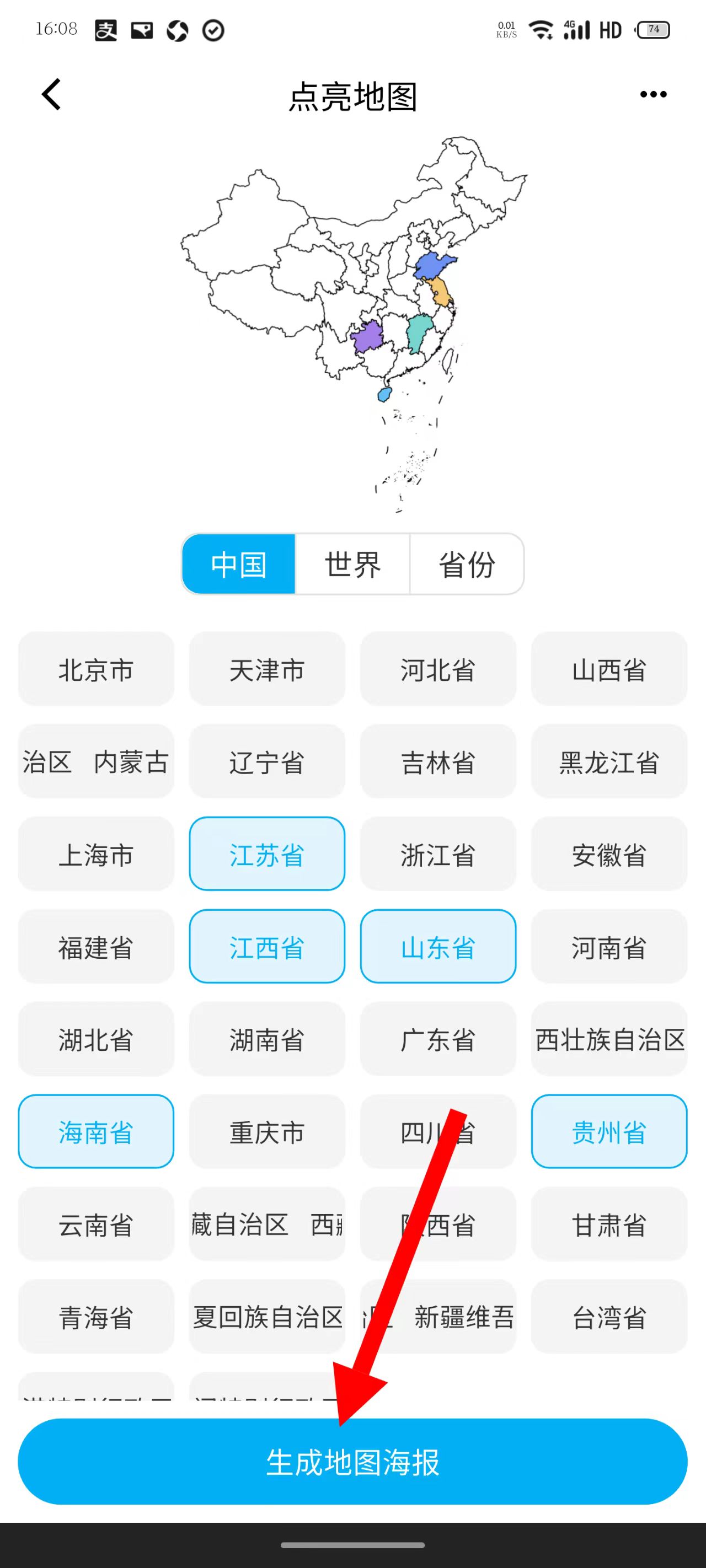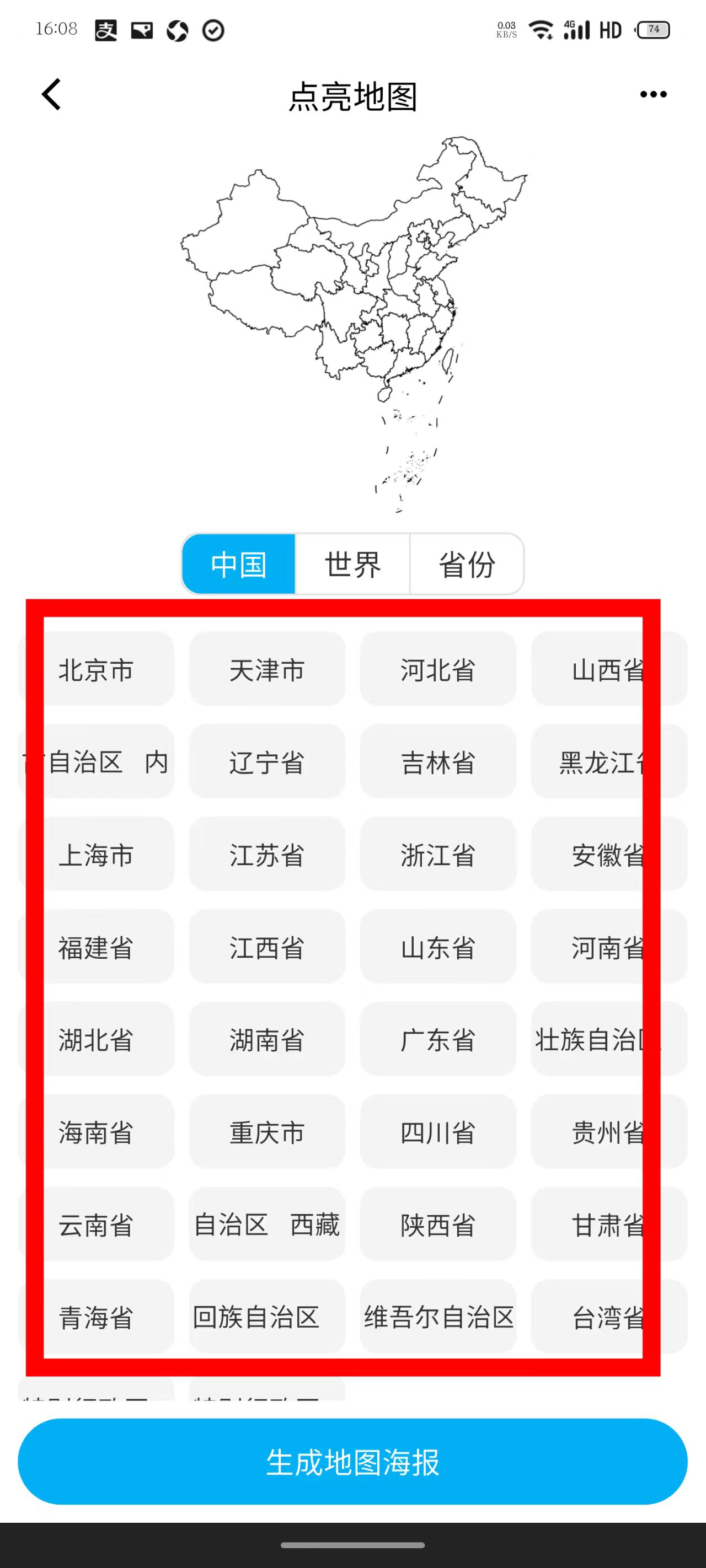 2、在點(diǎn)亮地圖頁(yè)面選擇去過(guò)的省份。
